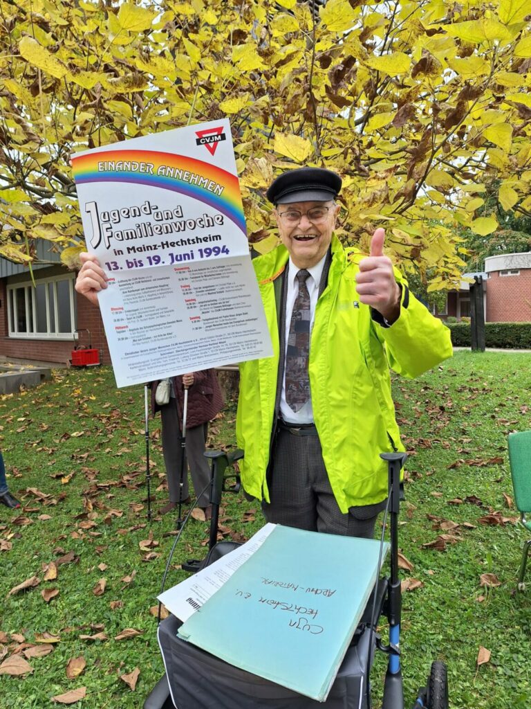 Auch Johann Jotzo als Gründungsvorsitzender war dabei und feierte mit. Er hatte einige Erinnerungsstücke dabei: So ein Plakat der „Jugend- und Familienwoche“, die der CVJM Hechtsheim 1994 veranstaltet hatte. Aber auch das letzte Exemplar einer Dokumentation, die Prof. Dr. Norbert Müller als Sporthistoriker zur Entstehung des Basketball-Spiels erstellt hatte. Basketball wurde von James Naismith 1891 beim YMCA in Springfield, Massachusetts, erfunden. Beides ist nun im Archiv des Vereines verstaut.